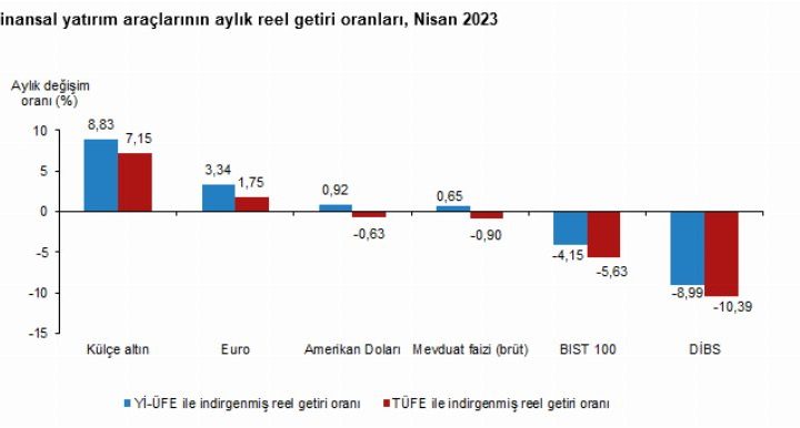 Aylık en yüksek reel getiri, yurt içi üretici fiyat endeksi (Yİ-ÜFE) ile indirgendiğinde yüzde 8,83, tüketici fiyat...