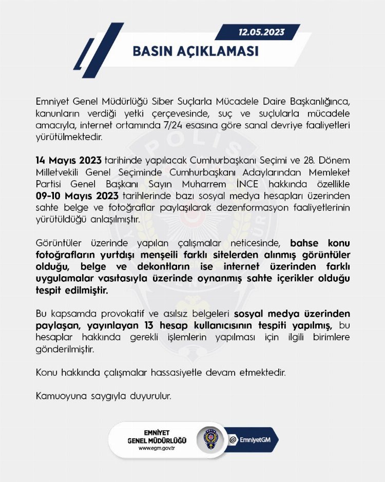 Emniyet Genel Müdürlüğü, Memleket Partisi Genel Başkanı Muharrem İnce hakkında “provokatif paylaşımda bulunan ve dezenformasyon faaliyeti yürüten 13 hesabın tespit edildiğini” açıkladı.