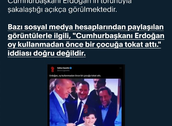 Cumhurbaşkanı Erdoğan’ın oy kullanmadan önce bir çocuğa tokat attığı iddiası Dezenformasyonla Mücadele Merkezi tarafından yalanlandı. ANKARA (İGFA)...