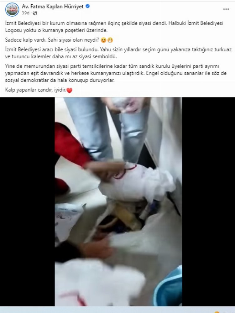 Kocaeli’de İzmit Belediye Başkanı Fatma Kaplan Hürriyet sosyal medya hesabından yaptığı paylaşımda İzmit Belediyesini sandık kurullarına ikram ettiği kumanya poşetlerine siyasi denilmesine tepki gösterdi