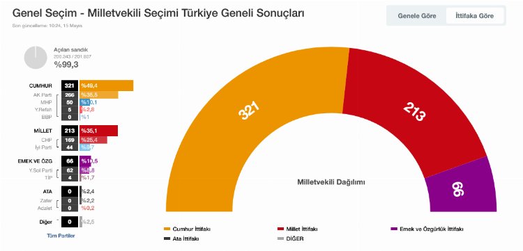 Cumhur İttifakı (Ak Parti 266, MHP 50, Yeniden Refah 5) 321 milletvekili, Millet İttifakı (CHP 169, İYİ Parti 44) 213 milletvekili, Emek ve Özgürlük İttifakı ise (Yeşil Sol 62, TİP 4) 66 milletvekili çıkardı.