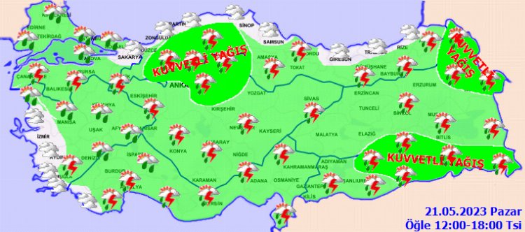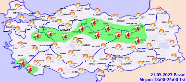 Meteoroloji, 21 Mayıs 2023 Pazar gününe ilişkin hava durumu raporunu yayımladı. Yurt genelinde yağışlı bir havanın etkili olması beklenirken, kuvvetli yağışlar nedeniyle ani sel, su baskını, yerel dolu, yıldırım, hortum ve ulaşımda aksamalar gibi olumsuzluklara karşı dikkatli olunması istendi.