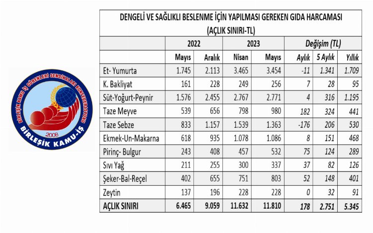 Birleşik Kamu-İş, açlık ve yoksulluk sınırı rakamlarını açıkladı. 36 aydır aralıksız artan gıda fiyatları açlık sınırını 12 bin liraya çıkardı.