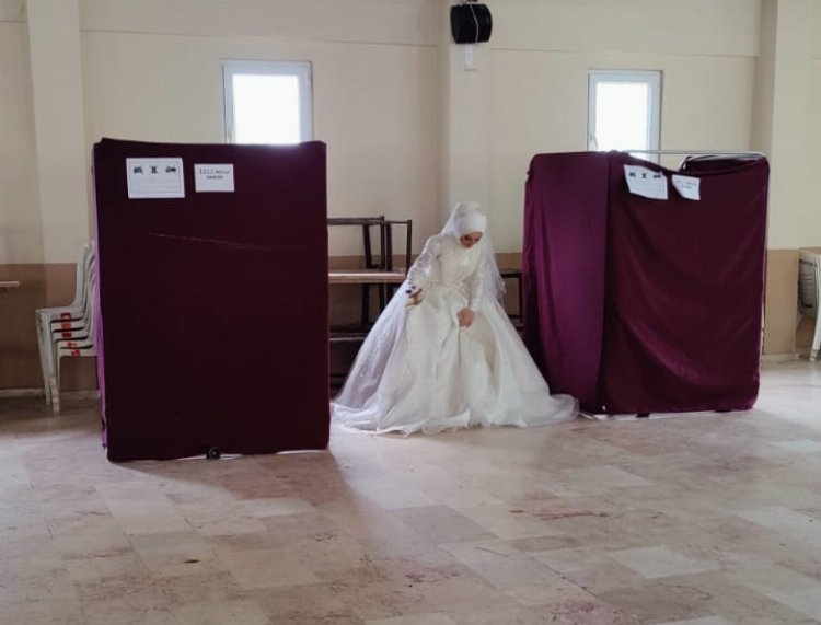 Bursa Yenişehir Çiçeközü köylü Sedef Buran, düğün gününde oy kullanmaya gelinliğiyle geldi.
