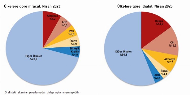 Nisan ayında ihracatta ilk sırayı Almanya aldı. Almanya’ya yapılan ihracat 1 milyar 590 milyon dolar olurken, bu ülkeyi sırasıyla; 1 milyar 163 milyon dolar ile ABD, 970 milyon dolar ile Irak, 954 milyon dolar ile İtalya, 945 milyon dolar ile Birleşik Krallık takip etti. İlk 5 ülkeye yapılan ihracat, toplam ihracatın %29,1’ini oluşturdu.