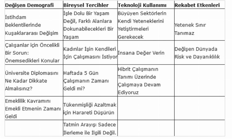 ManpowerGroup’un, “The New Human Age” isimli 2023 İş Gücü Trendleri Raporu’nda, çalışma hayatının geleceğini etkileyen 4 temel faktör ve 14 temel trendin tamamı aşağıdaki şekilde sıralandı: