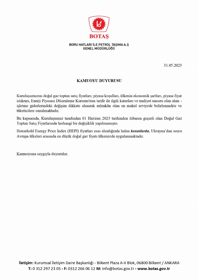 BOTAŞ açıklamasında, “Kuruluşumuzun doğal gaz toptan satış fiyatları; piyasa koşulları, ülkenin ekonomik şartları, piyasa fiyat istikrarı, Enerji Piyasası Düzenleme Kurumu’nun tarife ile ilgili kararları ve maliyet unsuru olan alım – işletme giderlerindeki değişim dikkate alınarak mümkün olan en makul seviyede belirlenmekte ve tüketicilere sunulmaktadır. Bu kapsamda, Kuruluşumuz tarafından 1 Haziran 2023 tarihinden itibaren geçerli olan Doğal Gaz Toptan Satış Fiyatlarında herhangi bir değişiklik yapılmamıştır. Household Energy Price Index (HEPI) fiyatlan esas alındığında halen konutlarda, Ukrayna’dan sonra Avrupa ülkeleri arasında en düşük doğal gaz fiyatı ülkemizde uygulanmaktadır. Kamuoyuna saygıyla duyurulur” ifadeleri yer aldı.