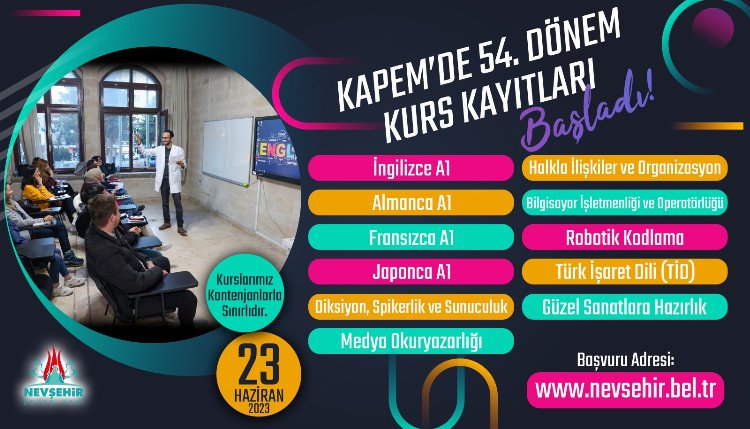 Nevşehir Belediyesi Gençlik ve Spor Hizmetleri Müdürlüğü bünyesinde alanında uzman eğitmen kadrosuyla düzenlediği kurslar sayesinde Nevşehirlilere ücretsiz sertifikalı imkanı sunan Kapadokya Eğitim Merkezi (KAPEM)’de 54. Dönem Kursları için kayıtlar başladı.