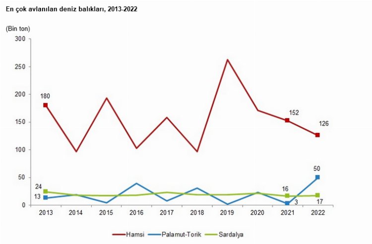 Avlanan deniz balıkları miktarı 254 bin 535 ton olarak gerçekleşti. Avlanan deniz balıklarının türlerine göre dağılımı incelendiğinde, hamsi balığının 125 bin 980 ton ile en yüksek miktarda avlanan balık olduğu görüldü. Hamsi balığını 49 bin 892 ton ile palamut-torik ve 16 bin 729 ton ile sardalya takip etti.