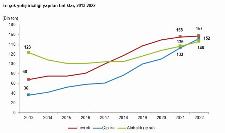 Yetiştirilen en önemli balık türü iç sularda 145 bin 649 ton ile alabalık, denizlerde ise 156 bin 602 ton ile levrek ve 152 bin 469 ton ile çipura oldu.