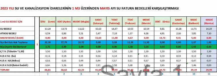 Söz konusu haberlerde 30 Büyükşehir Belediyesi arasında en yüksek su fiyatı olan ikinci kurum olarak MASKİ’nin gösterildiği anımsatılarak, “Yapılan haberde eksik veriler kullanılarak sadece su ve atıksu bedelleri dikkate alınmıştır. Ancak su faturalarına bu iki bedel ile birlikte bakım bedelleri ve diğer ücret kalemleri de yansıtılmaktadır. Bu bedeller hesaba katılarak yapılan 1 metreküplük suyun maliyetine göre 30 Büyükşehir içerisinde Manisa, 11. sırada yer almaktadır. Yapılan değerlendirme en yüksek ücret tarifesinin olduğu 1. Gruba göre yapılmıştır. Diğer gruplar baz alındığında ise Manisa, çok daha alt sıralardadır” denildi.
