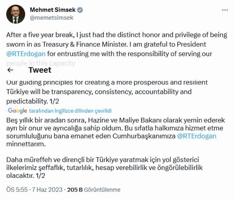 Beş yıllık aradan sonra, Hazine ve Maliye Bakanı olarak yemin ederek ayrı bir onur ve ayrıcalığa sahip olduğunu ifade eden Şimşek, İngilizce metinle yaptığı paylaşımda, “Bu sıfatla halkımıza hizmet etme sorumluluğunu bana emanet eden Cumhurbaşkanımız Recep Tayyip Erdoğan’a minnettarım. Daha müreffeh ve dirençli bir Türkiye yaratmak için yol gösterici ilkelerimiz şeffaflık, tutarlılık, hesap verebilirlik ve öngörülebilirlik olacaktır. Yerel ve uluslararası zorluklar arasında yol alırken, öngörülebilirliği artırmak için kurallara dayalı politika oluşturma taahhüdümüzü teyit ediyoruz. Kısa yollar veya hızlı düzeltmeler olmasa da, deneyimimizin, bilgimizin ve özverimizin önümüzdeki potansiyel engellerin üstesinden gelmemize yardımcı olacağından emin olabilirsiniz. Acil önceliğimiz, ekibimizi güçlendirmek ve güvenilir bir program tasarlamaktır” ifadelerini kullandı.
