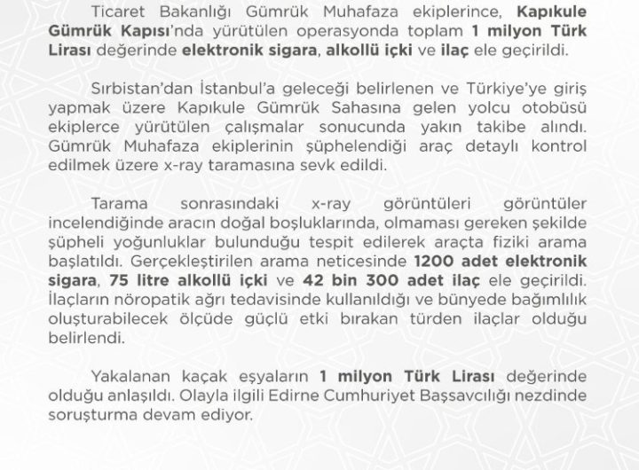 Ticaret Bakanlığı’na bağlı Gümrük Muhafaza ekipleri Kapıkule Gümrük Kapısı’nda yürütülen operasyonda toplamda 1 milyon TL değerinde elektronik...