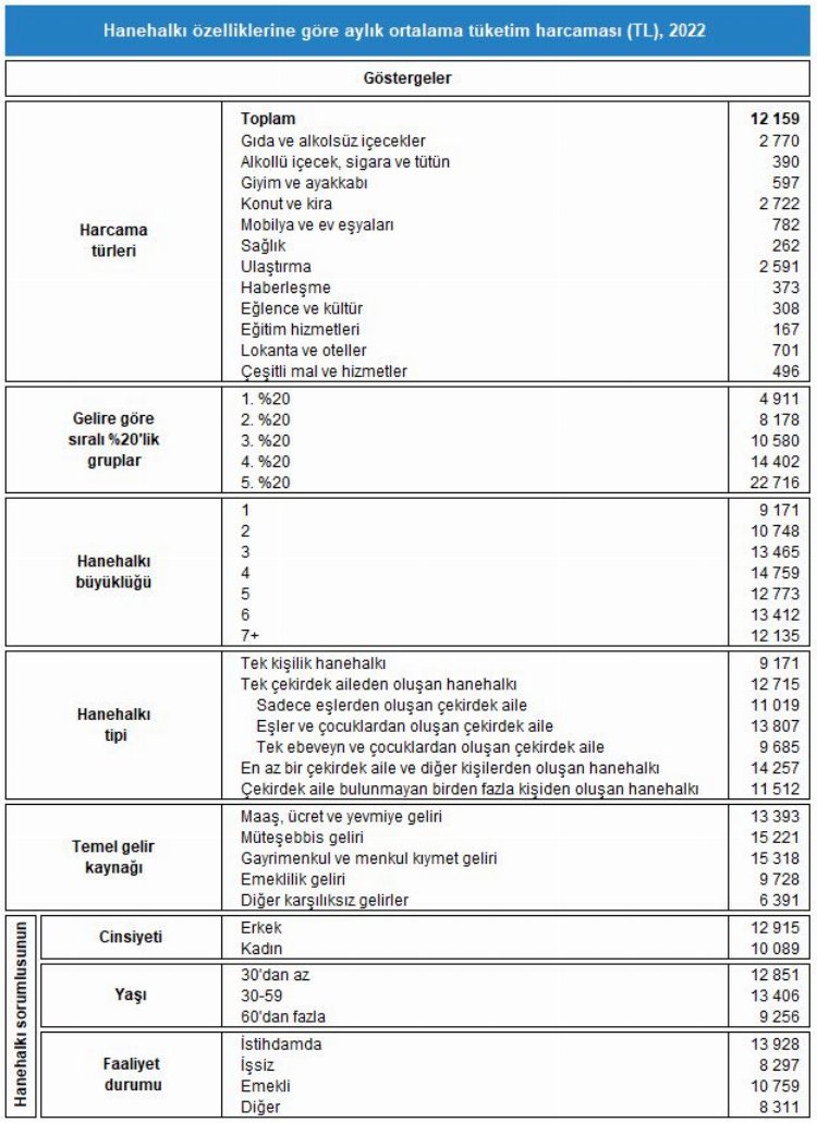 En düşük gelirli yüzde 20’de yer alan haneler aylık 4 bin 911 TL harcarken en yüksek gelirli yüzde 20’deki hanelerin harcaması 22 bin 716 TL oldu.