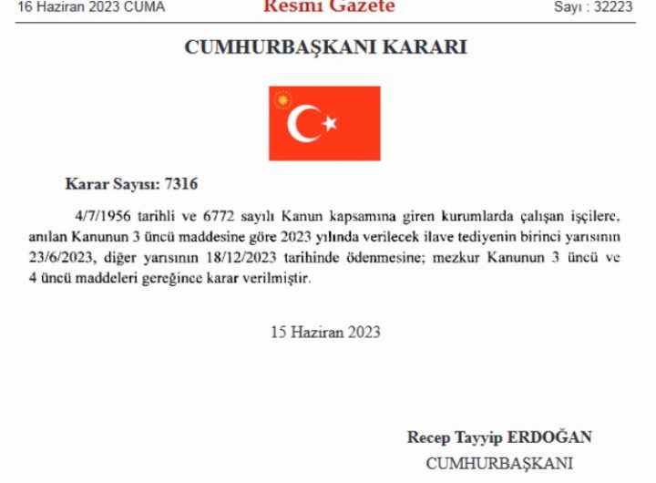 Kamuda çalışan işçilere 2023 yılında verilecek ek ödemenin ilk yarısı 23 Haziran’da, ikinci yarısı ise 18 Aralık’ta...