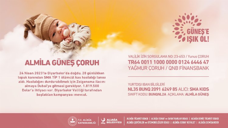 Aliağa’da kamu kurumları ve sivil toplum kuruluşları, Spinal Müsküler Atrofi (SMA) Tip-1 teşhisi konulan 1,5 aylık bebek Almila Güneş Çoruh’un tedavisi için birlik oldu.