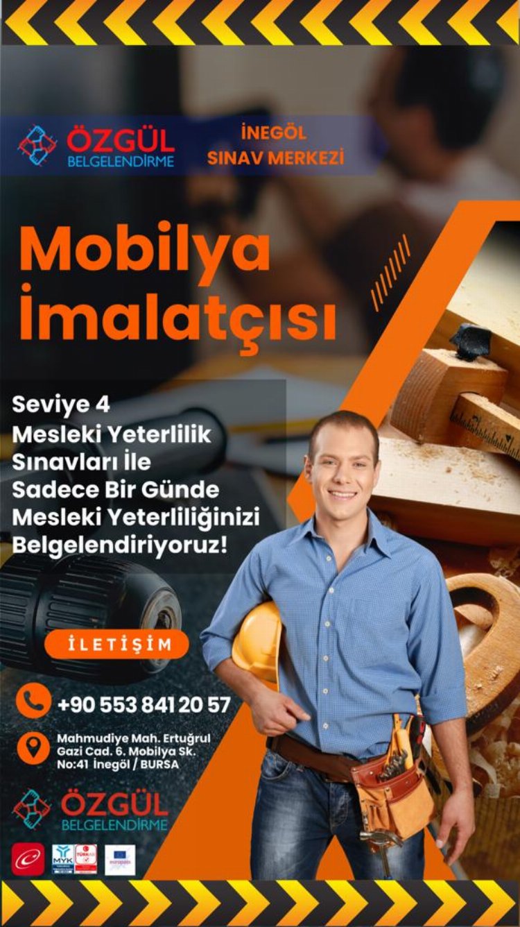 Hem mobilya imalatı, hem de döşemede çalışanlar mesleki yeterlilik belgesi almaları zorunlu hale geldi. Mobilya Mesleki Yeterlilik Belgesi için yetki alan ilk kuruluş Bursa İnegöl’den Özgül Belgelendirme oldu.