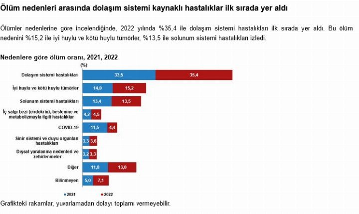 TÜİK verilerine göre bir yılda ölenlerin sayısı 2021’de 566 binken, geçen yıl 504 bine geriledi. Ölüm nedenleri...