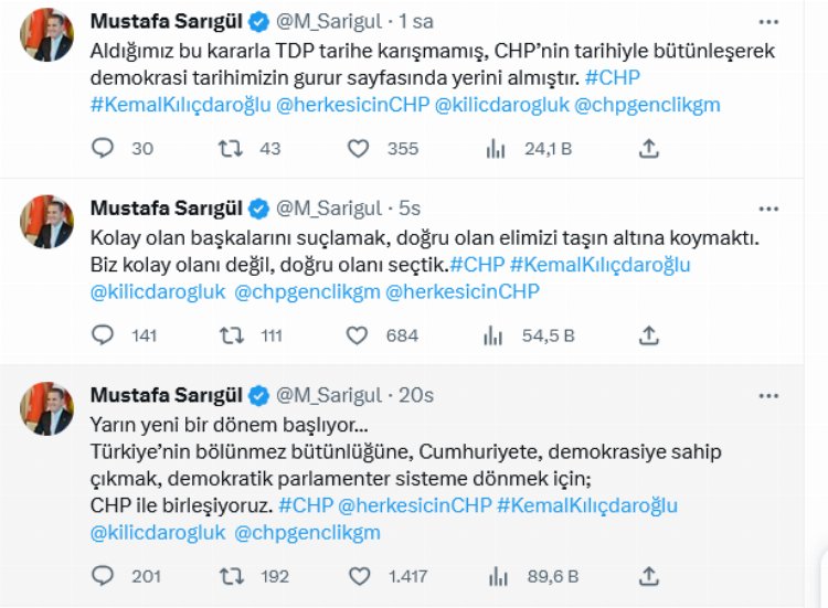 Sarıgül, “Aldığımız bu kararla TDP tarihe karışmamış, CHP’nin tarihiyle bütünleşerek demokrasi tarihimizin gurur sayfasında yerini almıştır” ifadelerini kullandı.