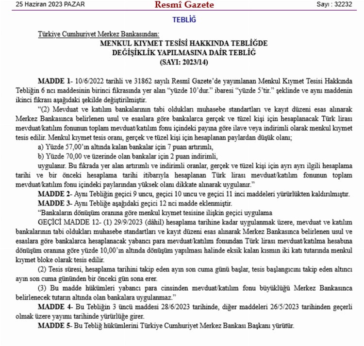 “29 Eylül 2023 (dahil) hesaplama tarihine kadar uygulanmak üzere, mevduat ve katılım bankalarının tabi oldukları muhasebe standartları ve kayıt düzeni esas alınarak Merkez Bankasınca belirlenen usul ve esaslara göre bankalarca hesaplanacak yabancı para mevduat/katılım fonundan Türk lirası mevduat/katılma hesabına dönüşüm oranına göre yüzde 10’un altında dönüşüm yapılması halinde eksik kalan kısmın iki katı tutarında menkul kıymet bloke olarak tesis edilir. Tesis süresi, hesaplama tarihini takip eden ayın son cuma günü başlar, tesis başlangıcını takip eden altıncı ayın son cuma gününden bir önceki gün sona erer. Bu madde hükümleri yabancı para cinsinden mevduat/katılım fonu büyüklüğü Merkez Bankasınca belirlenecek tutarın altında olan bankalara uygulanmaz.”