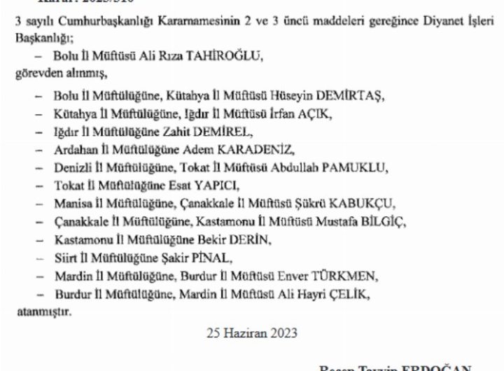 Cumhurbaşkanlığı kararıyla Bolu Müftüsü görevden alınırken, 5 ile yeni müftü atandı, 7 il müftüsünün ise yerleri değiştirildi....
