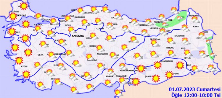 ANKARA (İGFA) – Ülkemizin kuzeydoğu kesimlerinin parçalı bulutlu, öğleden sonra Trabzon, Rize ve Artvin’in iç kesimleri ile Van’ın doğu ilçelerinin sağanak ve gök gürültülü sağanak yağışlı, diğer yerlerin az bulutlu ve açık geçeceği tahmin ediliyor.