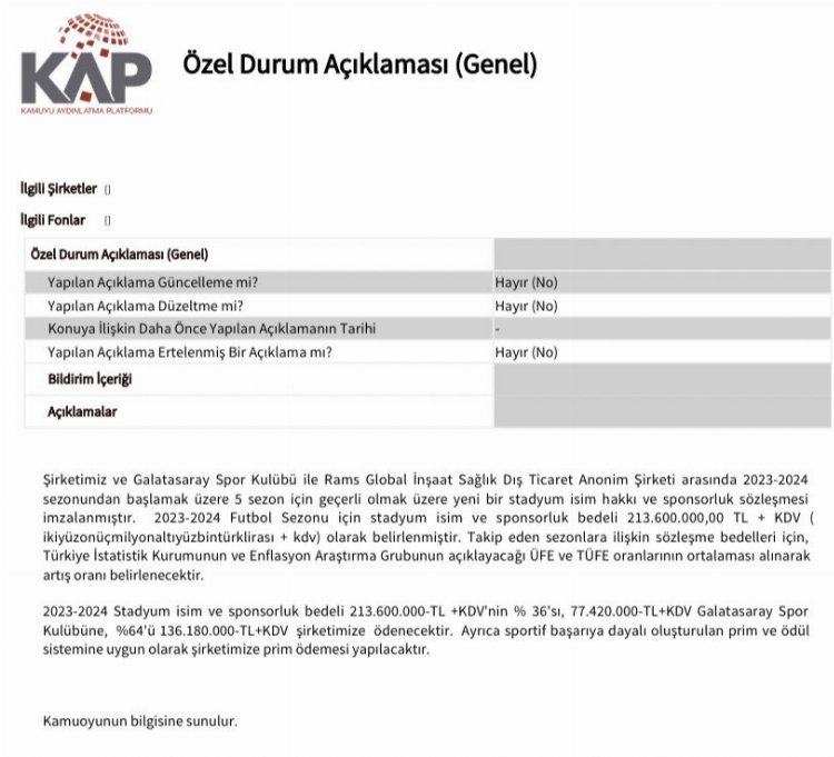 İSTANBUL (İGFA) – Galatasaray’dan KAP’a yapılan bildirimde, “2023-2024 Futbol Sezonu için stadyum isim ve sponsorluk bedeli 213.600.000,00 TL + KDV (ikiyüzonüçmilyonaltıyüzbintürklirası + kdv) olarak belirlenmiştir. Takip eden sezonlara ilişkin sözleşme bedelleri için, Türkiye İstatistik Kurumu’nun ve Enflasyon Araştırma Grubunun açıklayacağı ÜFE ve TÜFE oranlarının ortalaması alınarak artış oranı belirlenecektir” denildi.