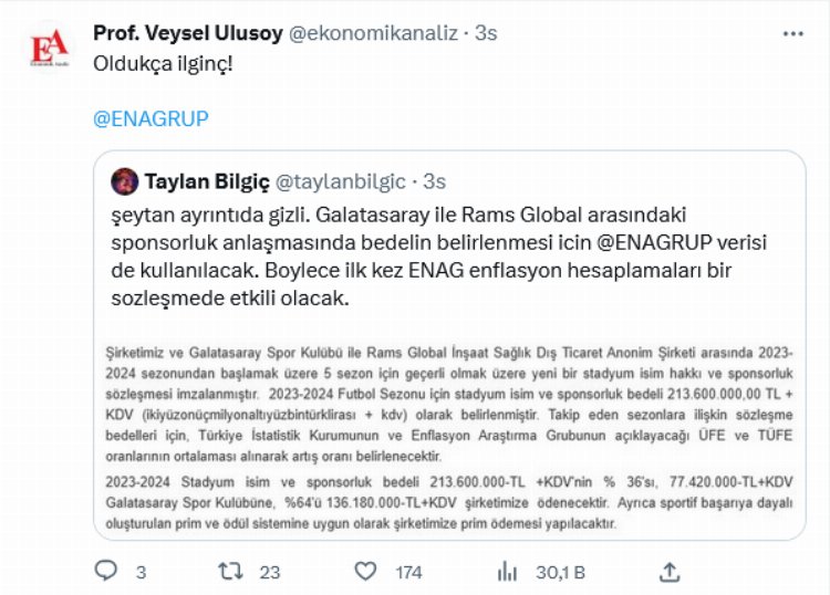 Galatasaray Kulübü’nün son sponsorluk anlaşması nedeniyle Kamuyu Aydınlatma Platformu’na (KAP) yaptığı bildirimde, Türkiye İstatistik Kurumu’nun (TÜİK) yanı sıra, bağımsız ekonomistlerden oluşan Enflasyon Araştırma Grubu’nun (ENAG) açıklayacağı oranları da hesaplamaya katacağını belirtmesi, sosyal medyada gündem oldu.
