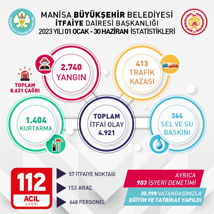 Manisa Büyükşehir Belediyesi İtfaiye Dairesi Başkanlığı ekipleri, ilk 6 aylık süreçte sadece olaylara müdahale etmekle kalmadı, bunun yanında vatandaşların bilgilendirilmesinde de önemli rol oynadı. Yapmış oldukları eğitim ve tatbikatlar ile 30 bin 998 vatandaşın bilgilendirilmesi sağlanırken, 903 işyeri de denetlenerek işyeri güvenliğinin sağlanmasına katkı verdi.