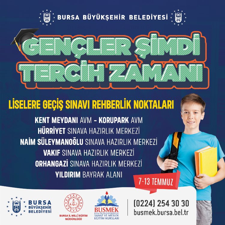 BURSA (İGFA) – Bursa Büyükşehir Belediyesi Sosyal Hizmetler Dairesi Başkanlığı, Hayat Boyu Öğrenme Şube Müdürlüğü her yaştan kesime sağladığı eğitim desteklerini sürdürüyor. Kentin farklı noktalarına kurulacak “Lise Tercih Rehberlik Noktaları” ile LGS’ye giren gençlerin doğru tercihlerle istedikleri liselere girebilmeleri için uzman rehberlerle ücretsiz danışmanlık desteği verilecek.