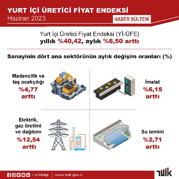 Türkiye İstatistik Kurumu (TÜİK) Yurt İçi Üretici Fiyat Endeksi (Yİ-ÜFE) verilerini açıkladı. Buna göre üreticinin enflasyonu yıllık yüzde 40,42, aylık yüzde 6,50 oldu.