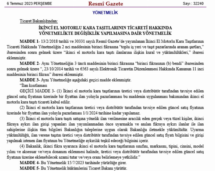 İkinci el araçların üretici veya distribütörce tavsiye edilen güncel satış fiyatının üzerinde fiyattan ilanla pazarlanmasına 2024’e kadar kısıtlama getirildi. Resmi Gazete’de yayımlanan ve 15 Temmuz’da yürürlüğe girecek karar sonrasında Ticaret Bakanlığı, sektöre yönelik ilave tedbirlere yönelik basın açıklaması yaptı.