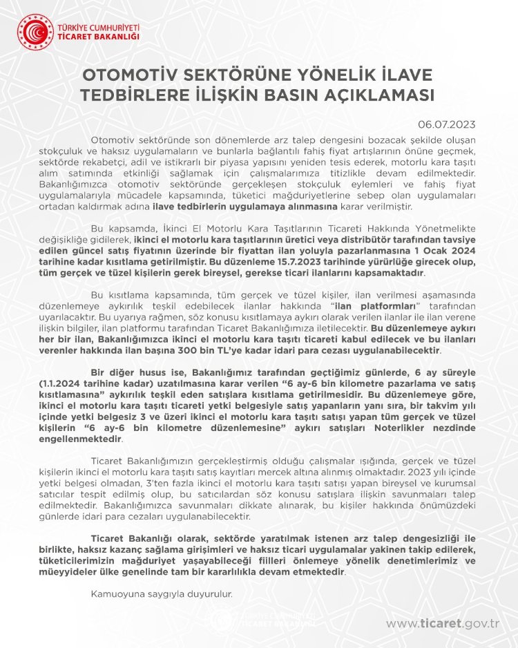 1 Ocak 2024’e kadar uzatılmasına karar verilen “6 ay-6 bin kilometre pazarlama ve satış kısıtlamasına” aykırılık teşkil eden satışlara kısıtlama getirildiği anımsatılan bakanlığın açıklamasında şu ifadeler yer aldı: