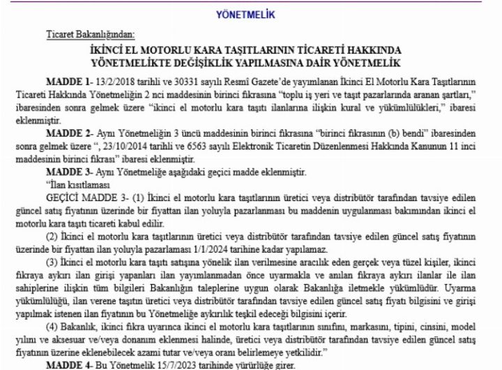 İkinci el araçların üretici veya distribütörce tavsiye edilen güncel satış fiyatının üzerinde fiyattan ilanla pazarlanmasına 2024’e kadar...