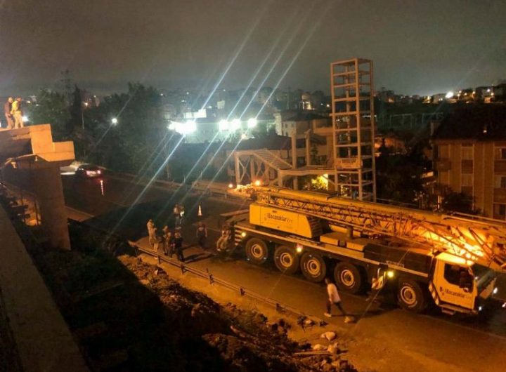 Kocaeli Büyükşehir Belediyesi tarafından Darıca Eskihisar feribot yolu üzerinde yapılan yaya üstgeçidinin prekast kirişlerin montajı yapıldı KOCAELİ...
