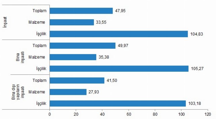 Bina dışı yapılar için inşaat maliyet endeksi, bir önceki aya göre yüzde 0,22 azaldı, bir önceki yılın aynı ayına göre yüzde 41,50 arttı. Bir önceki aya göre malzeme endeksi yüzde 0,78 azaldı, işçilik endeksi yüzde 1,42 arttı. Ayrıca bir önceki yılın aynı ayına göre malzeme endeksi yüzde 27,93, işçilik endeksi yüzde 103,18 arttı.