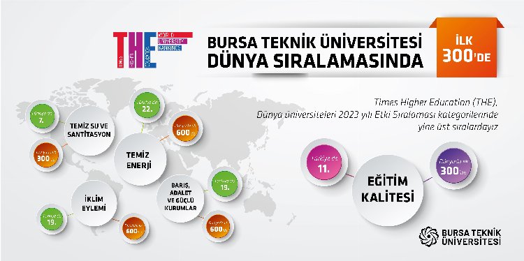 BTÜ, Times HigherEducation (THE), 2023 yılı Etki Sıralamasında altı kategoride Türk Üniversiteleri arasında ilk otuz üniversite arasında kendine yer buldu. “Nitelikli Eğitim” kategorisinde Türkiye’de 11. sırada yer alan BTÜ, Dünya sıralamasında ilk 300’e girdi. “Temiz Su ve Sıhhi Koşullar” kategorisinde Dünya genelinde ilk 300 üniversite arasında giren Bursa Teknik Üniversitesi, Türk üniversiteleri arasında 7. sırayı elde etti.
