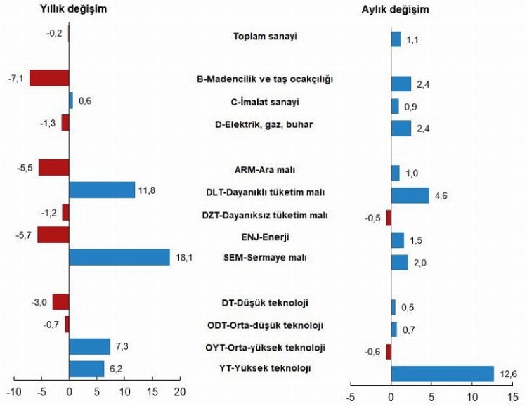 TÜİK’in yeni açıkladığı istatistiki verilere göre sanayi üretimi aylık yüzde 1,1 artarken, yıllık yüzde 0,2 oranında azaldı.