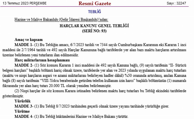 Cumhurbaşkanı Recep Tayyip Erdoğan’ın imzasıyla Resmi Gazete’de yayımlanan karara göre harçlara yapılan yüzde 50 oranındaki artışla birlikte aralarında pasaport, sürücü belgesi gibi bir çok harçların da olduğu yeni tarifeler açıklandı.