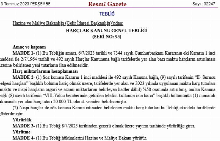 Cumhurbaşkanı Recep Tayyip Erdoğan’ın imzasıyla Resmi Gazete’de yayımlanan karara göre harçlara yapılan yüzde 50 oranındaki artışla birlikte...