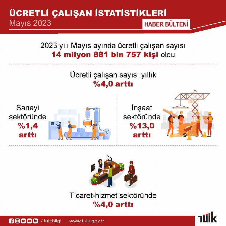 Ücretli çalışanların alt detaylarına bakıldığında; 2023 yılı Mayıs ayında ücretli çalışanlar aylık olarak sanayi sektöründe yüzde 0,3, inşaat sektöründe yüzde 1,5 ve ticaret-hizmet sektöründe yüzde 0,8 arttı.