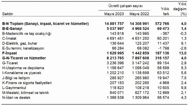 Sanayi, inşaat ve ticaret-hizmet sektörleri toplamında ücretli çalışan sayısı 2023 Mayıs ayında bir önceki aya göre yüzde 0,7 artış oldu.