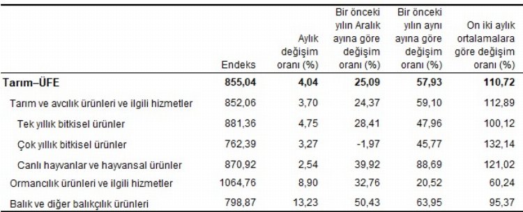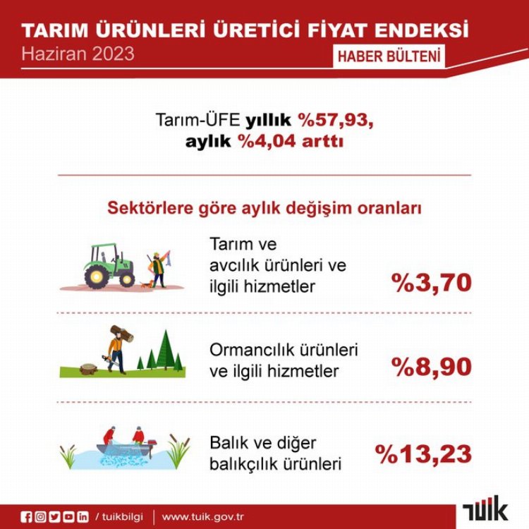 Tarım Ürünleri Üretici Fiyat Endeksi (Tarım ÜFE) Haziran ayında bir önceki aya göre yüzde 4,04, geçen yılın aynı ayına kıyasla yüzde 57,93 artış gösterdi.