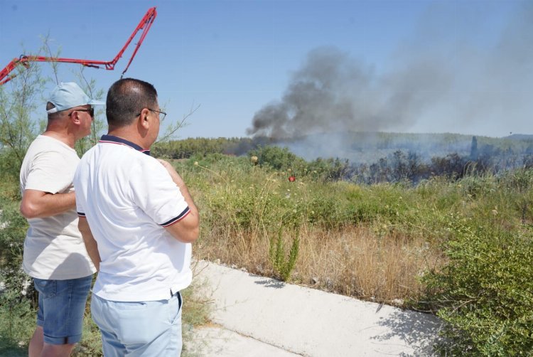 MUĞLA (İGFA) – Milas-Bodrum Havalimanı kavşağında yol kenarında başlayan yangının ilk dakikalarından itibaren Milas Belediye Başkanı Muhammet Tokat bölgeye gelerek incelemelerde bulundu.