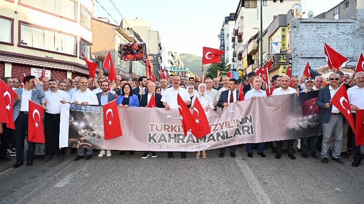 Atatürk Heykeli önünden başlayıp 15 Temmuz Demokrasi Meydanı’nda sona eren yürüyüşe, Bursa Büyükşehir Belediye Başkanı Alinur Aktaş’ın yanı sıra Vali Yakup Canbolat, Bursa Milletvekilleri, AK Parti İl Başkanı Davut Gürkan, ilçe belediye başkanları, siyasi parti temsilcileri, askeri erkân katıldı. Büyük bir coşkunun yaşandığı yürüyüşte, vatandaşlar ellerindeki Türk Bayraklarıyla ‘Şehitler ölmez, vatan bölünmez’ sloganları attı. Yoğun katılımın olduğu etkinlikte, Büyükşehir Belediye Bandosu’nun ve Mehter Takımı’nın marşlarıyla coşku doruğa çıktı. Büyükşehir Belediyesi tarafından hazırlanan dev bayrak da vatandaşların ellerinde Demokrasi Meydanı’na getirildi. Yürüyüşün ardından Demokrasi Meydanı’nda düzenlenen tören, saygı duruşu, İstiklal Marşı’nın okunması, Kuran’ı Kerim tilaveti ve mehter gösterileriyle devam etti.