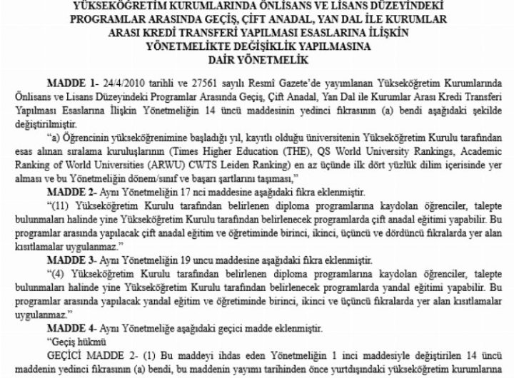 Yükseköğretim kurumlarında ön lisans ve lisans düzeyindeki programlar arasında geçiş, çift ana dal, yan dal ile kurumlar...