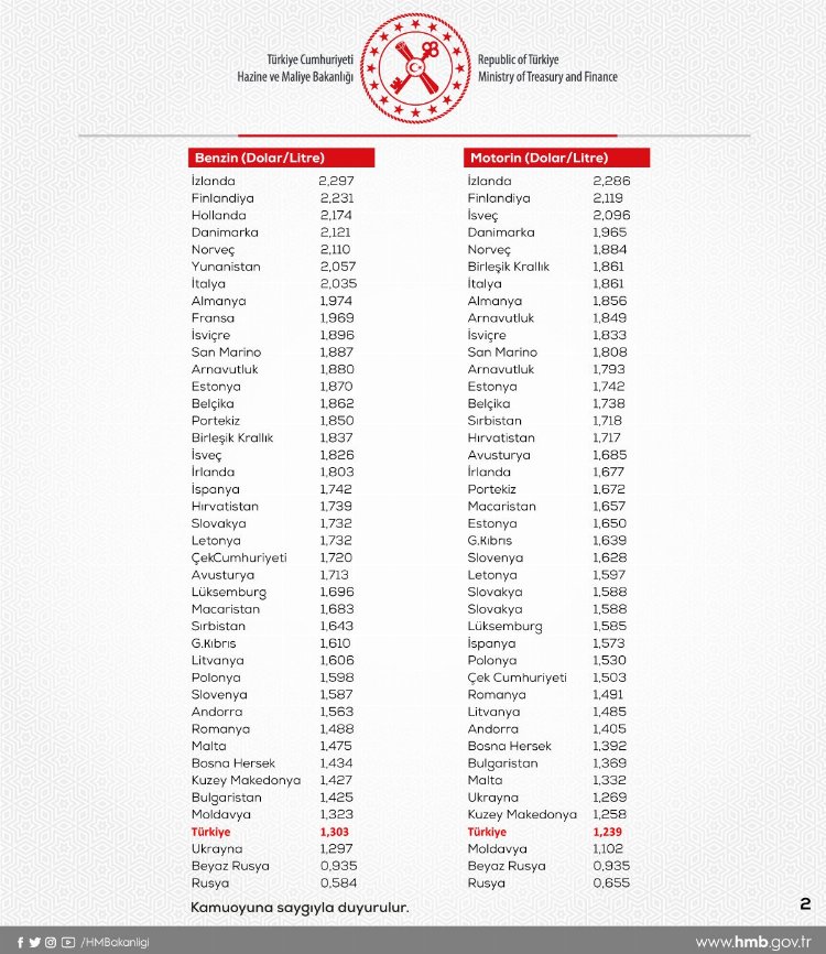 Akaryakıttaki ÖTV artışı sonrası gelen tepkilere benzin ve motorinin ülkeler arası fiyatlarına yönelik karşılaştırmalı tablo ile yanıt veren Hazine ve Maliye Bakanlığı, benzinde ve motorinde Avrupa’nın en ucuz 4’üncü ülkesi olduğunu açıkladı.