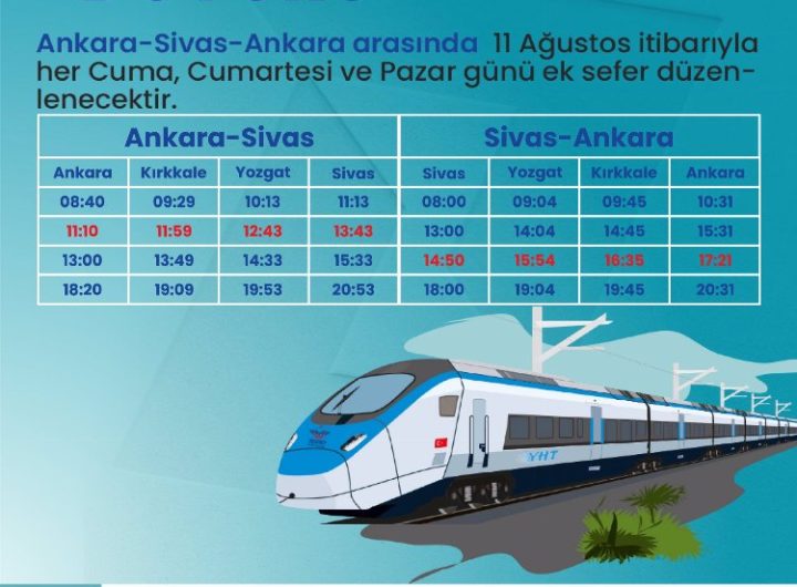 Yolcu yoğunluğu ve taleplerinin karşılanması için Ankara-Sivas YHT hattında 11 Ağustos itibarıyla Cuma, Cumartesi ve Pazar günleri...