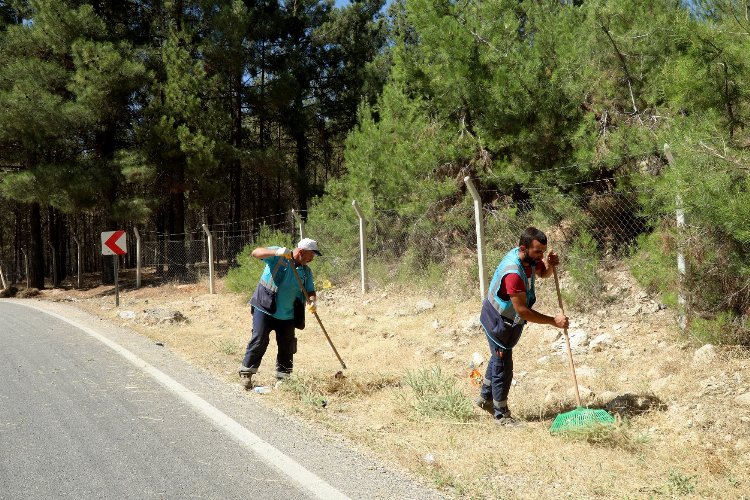 Ormanları koruma kapsamında yürütülen çalışmada 105 personel 7 iş makinası ve 5 taşıyıcı araçla ormanların sınırlarında bulunan yolların kenarlarında otlar biçiliyor, yangın oluşturabilecek başta cam kırıkları olmak üzere çöpler toplanıyor.