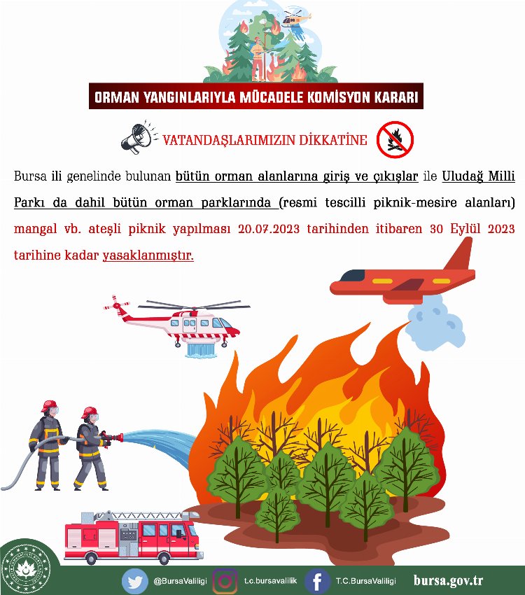 Ancak Bursa Valiliği tarafından yapılan açıklamada, Türkiye’nin güney ve batı bölgelerinde devam eden büyük orman yangınları ile meteorolojiden alınan son bilgiler çerçevesinde, Bursa’yı da etkisi altına alan yüksek sıcaklık ve kuvvetli rüzgarların orman yangınları riskini arttıracağı değerlendirilerek, ilave tedbirlerin alınmasına karar verildiği açıklandı.